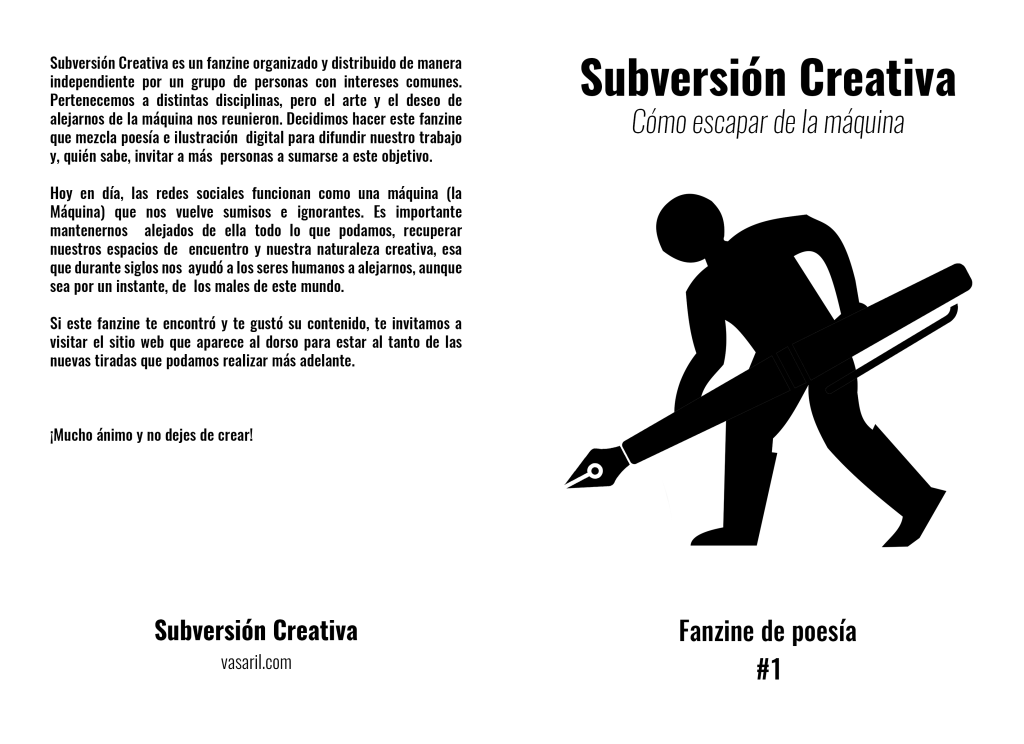 Subversión Creativa es un fanzine organizado y distribuido de manera independiente por un grupo de personas con intereses comunes. Pertenecemos a distintas disciplinas, pero el arte y el deseo de alejarnos de la máquina nos reunieron. Decidimos hacer este fanzine que mezcla poesía e ilustración digital para difundir nuestro trabajo y, quién sabe, invitar a más personas a sumarse a este objetivo.